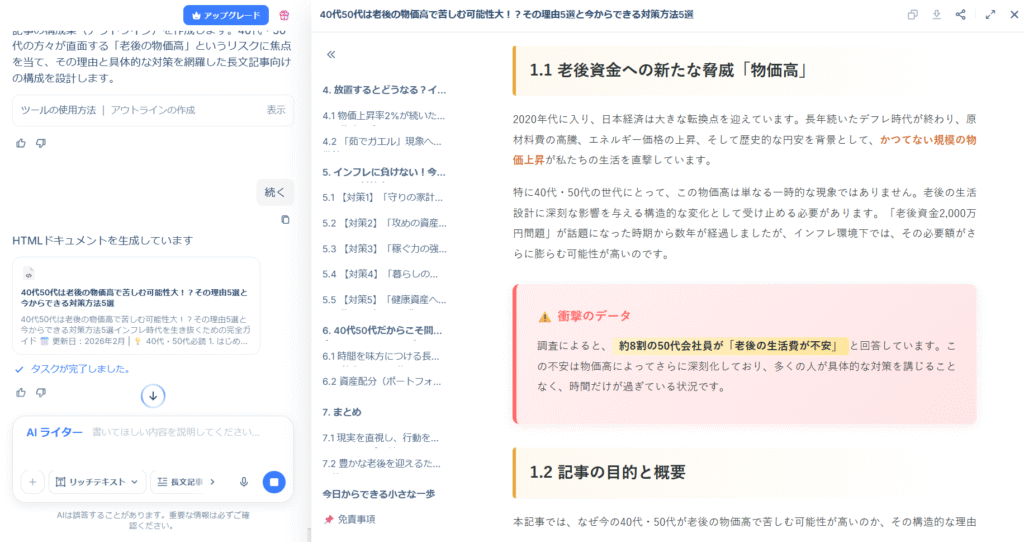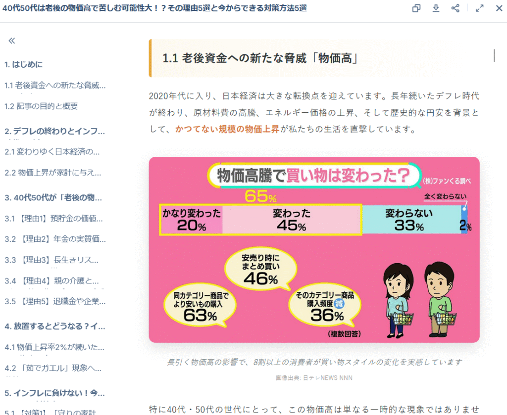 実験:「40代50代の老後物価高」をテーマに記事を書かせてみた