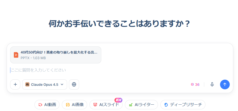 しかし、HIX AIであればClaude Opus 4.5を選択したうえでパワーポイントのファイルをそのままアップすることが可能です。
