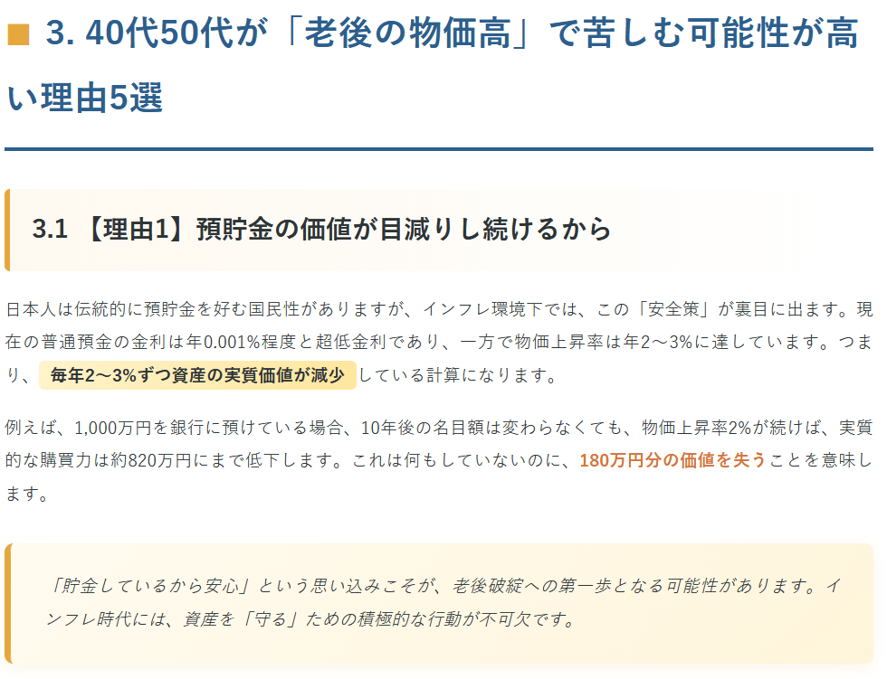 AIライターで生成した全文は長くなりすぎるので、今回のテーマで重要な「40代50代は老後の物価高で苦しむ理由5選」のうち3つをそのままスクショで貼っておきます↓