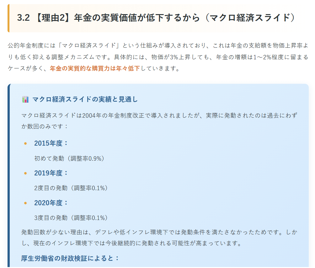 今回は「3.2 【理由2】年金の実質価値が低下するから(マクロ経済スライド)」より下記の文章です。