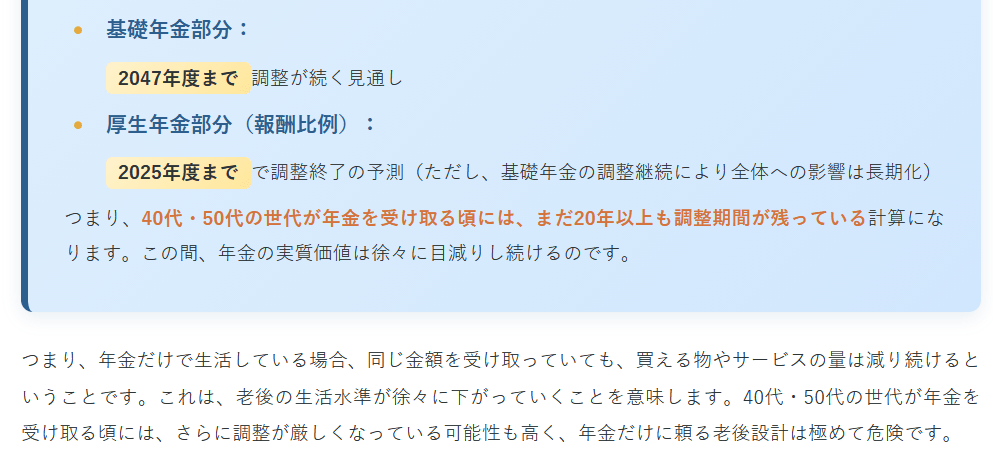 つまり、40代・50代の世代が年金を受け取る頃には、まだ20年以上も調整期間が残っている計算になります。この間、年金の実質価値は徐々に目減りし続けるのです。