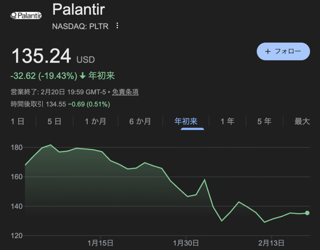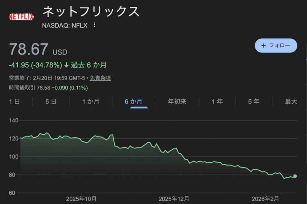 一方で、FANG+は入れ替えで入った中型銘柄も10%で保有しているので、年初来で約20%も下落しているパランティアや直近半年で約34%以上も下落しているNetflixの影響をモロに受けています。